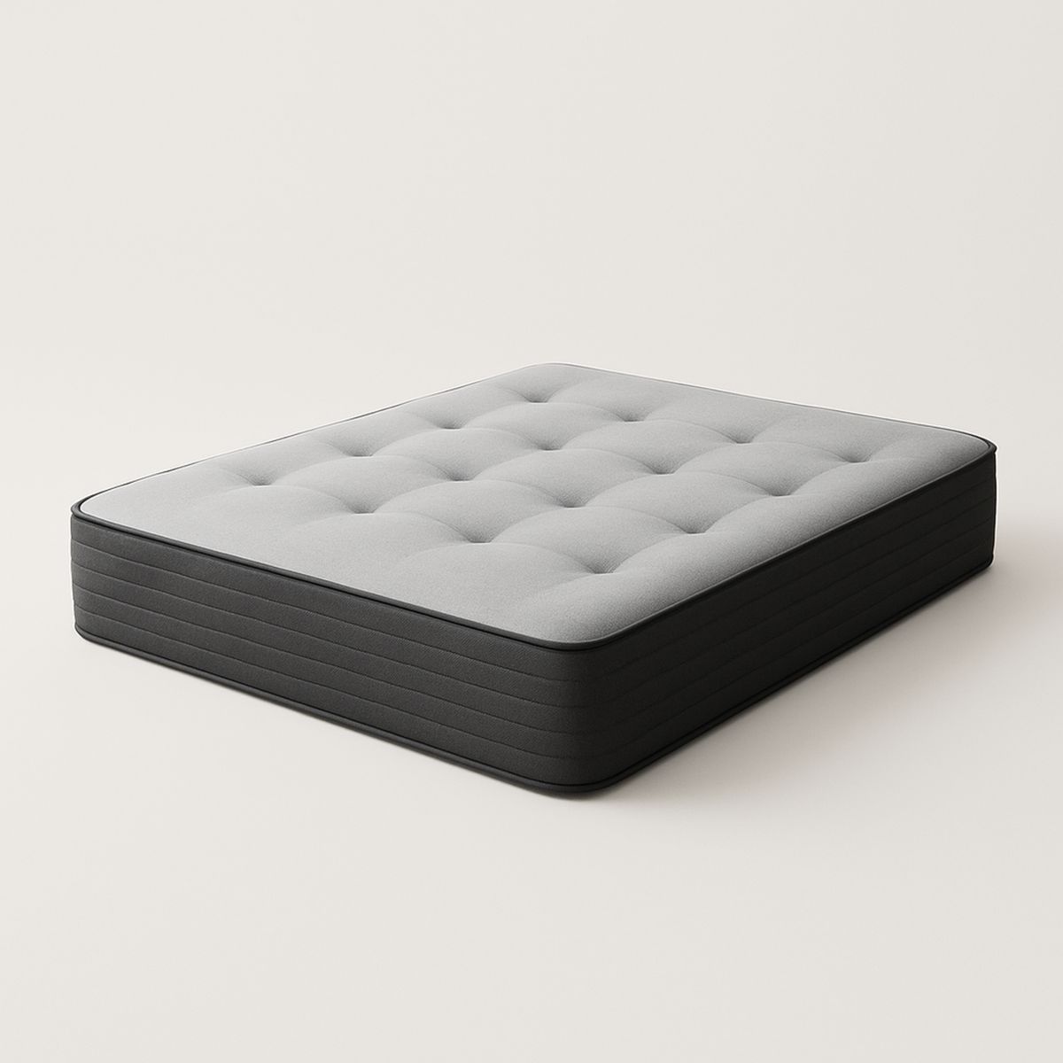 Colchão com núcleo de espuma viscoelástica e cobertura em tecido de poliéster cinza claro. Dimensões: 200 cm x 140 cm x 25 cm. Peso: 25 kg.